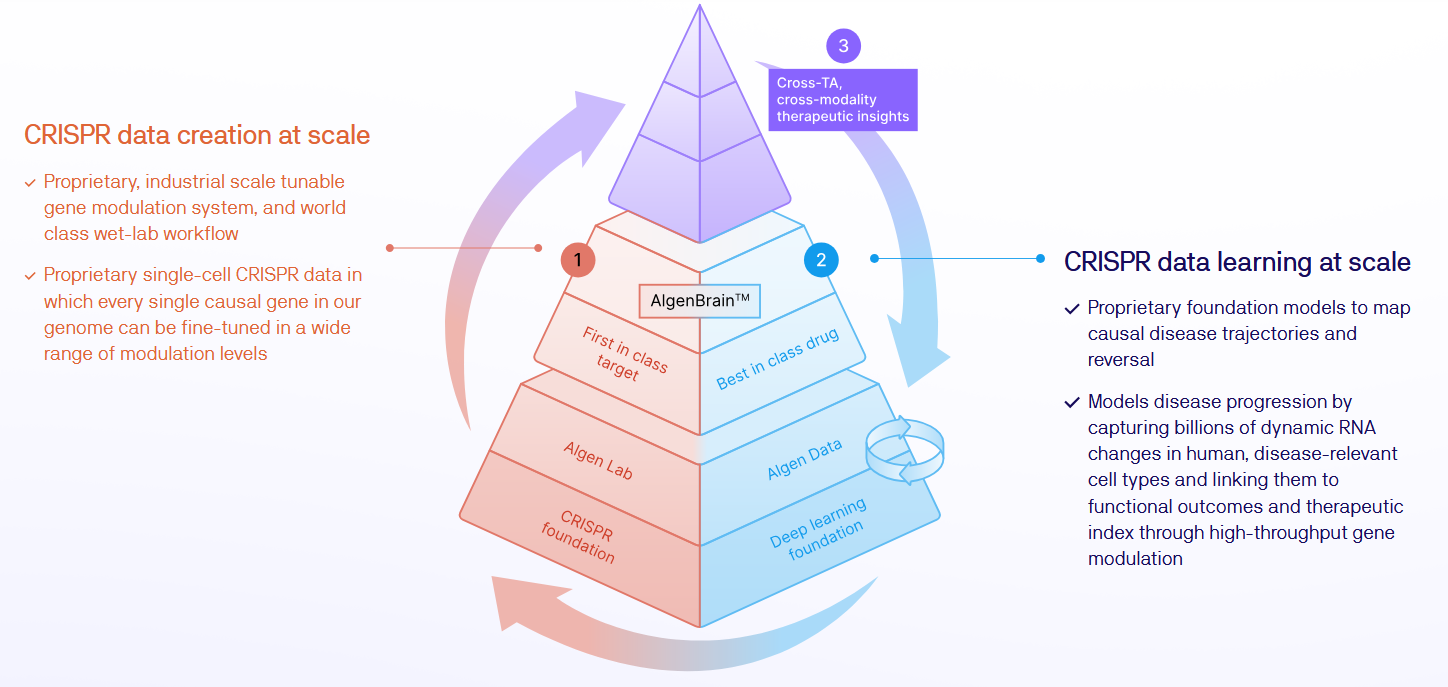 Algen describes a disease-agnostic platform that couples CRISPR perturbation with its “AlgenBrain” foundation models to reverse-engineer disease trajectories and pinpoint causal intervention points. It generates proprietary single-cell CRISPR datasets using an industrial-scale tunable gene-modulation system; the models then capture “billions of dynamic RNA changes in human, disease-relevant cell types” and link them to functional outcomes and therapeutic index.