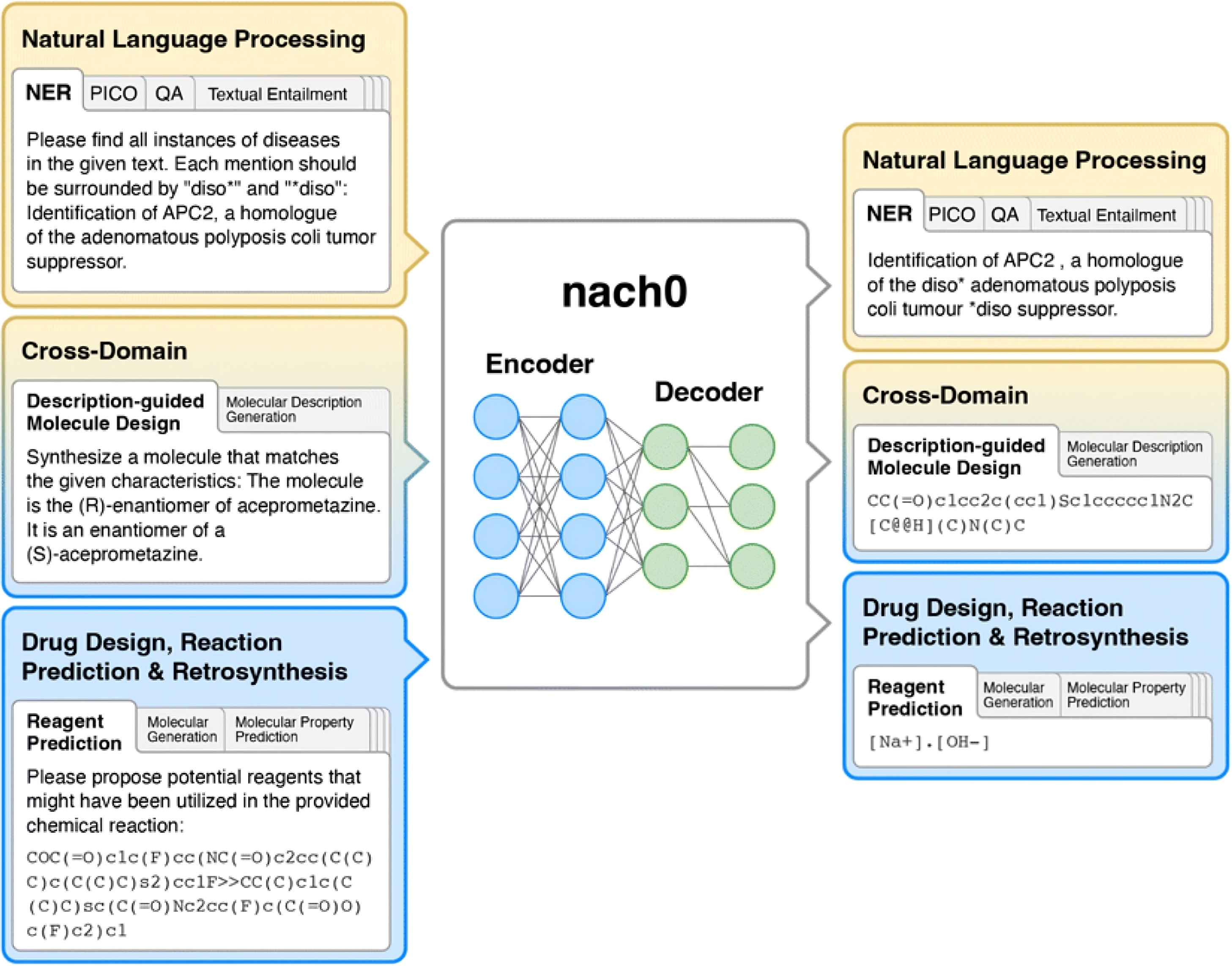 nach0 text-to-text framework, from Chemical Science (Issue 22, 2024). The model maps text inputs to task-specific target text using a unified architecture, loss function, and training setup across mono-domain (NLP, chemistry) and cross-domain (NLP–chemistry) tasks.