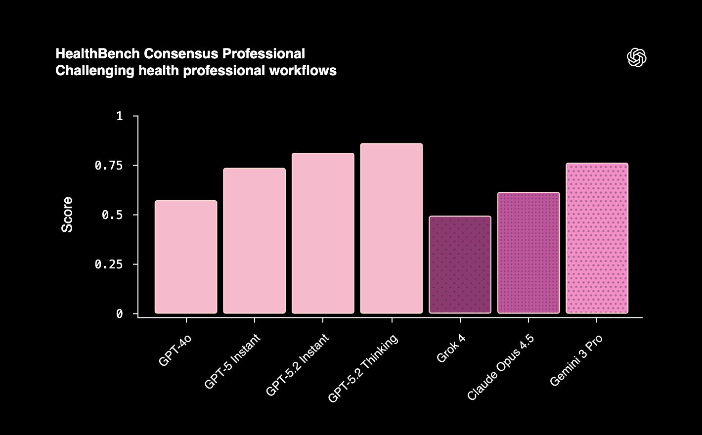 In HealthBench Consensus evaluations focused on complex clinical workflows, GPT‑5.2 models outperformed all comparator systems.