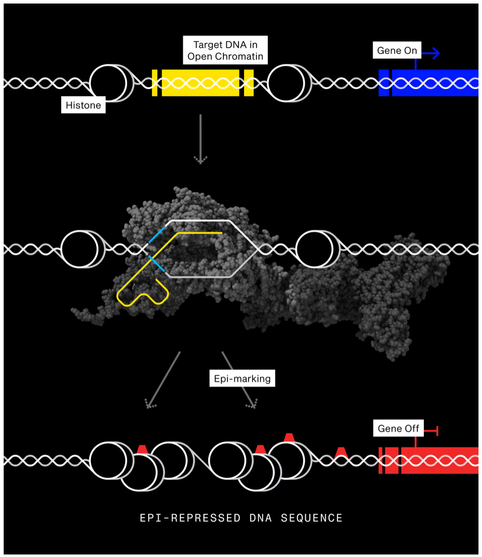 Normally, enzymes like DNMT3A (which add methylation marks to DNA to silence genes) are held in an inactive state and only activated when they encounter the right signals in the cell. Scribe’s ELXR integrates this autoinhibitory domain into its CRISPR construct, allowing the system to remain inactive until specific chromatin conditions are met at the target site.