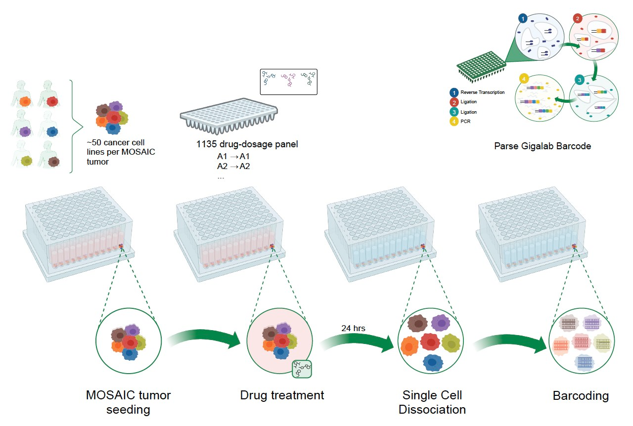 "With 50 cell lines in each Mosaic pool, we measure how various cell lines, with varying baseline genetics and gene expression, respond to various treatments. And using a cell village means we eliminate batch effects and allow extreme parallelization."